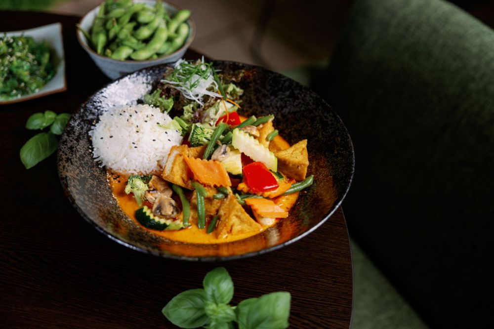 Mango-Kokos-Curry Soße mit Zitronengras und Gemüse, serviert mit Reis.