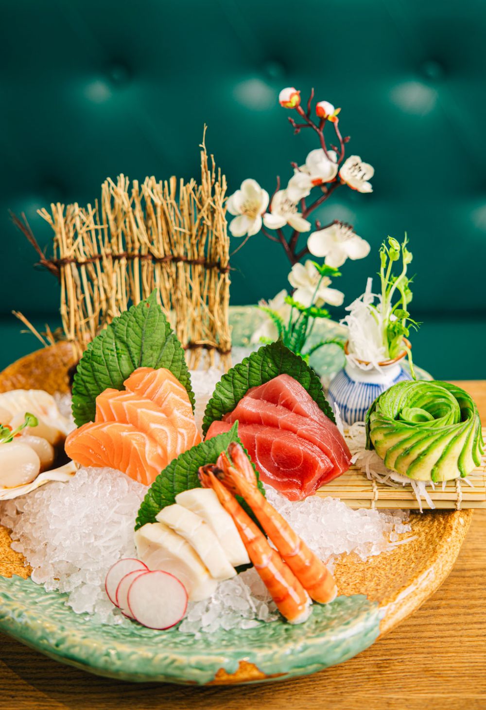 6 stk. Sashimi, 5 stk. Nigiri, 16 stk. I.O Roll, 6 stk. Crunchy Roll