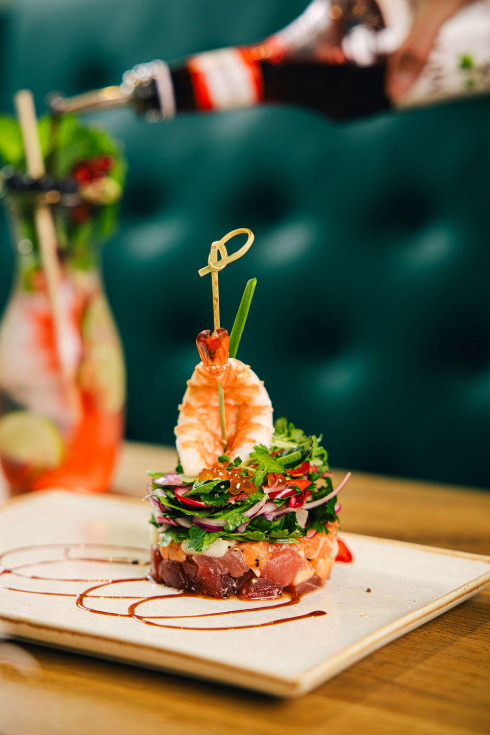 Spicy Lachs Tatar, Avocado, Gurke, Tobiko, flambierten Lachs und Schnittlauch