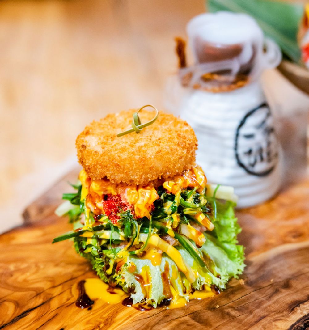 Panierte vegetarische Füllung, Lachs, Sesam, Miso Soße