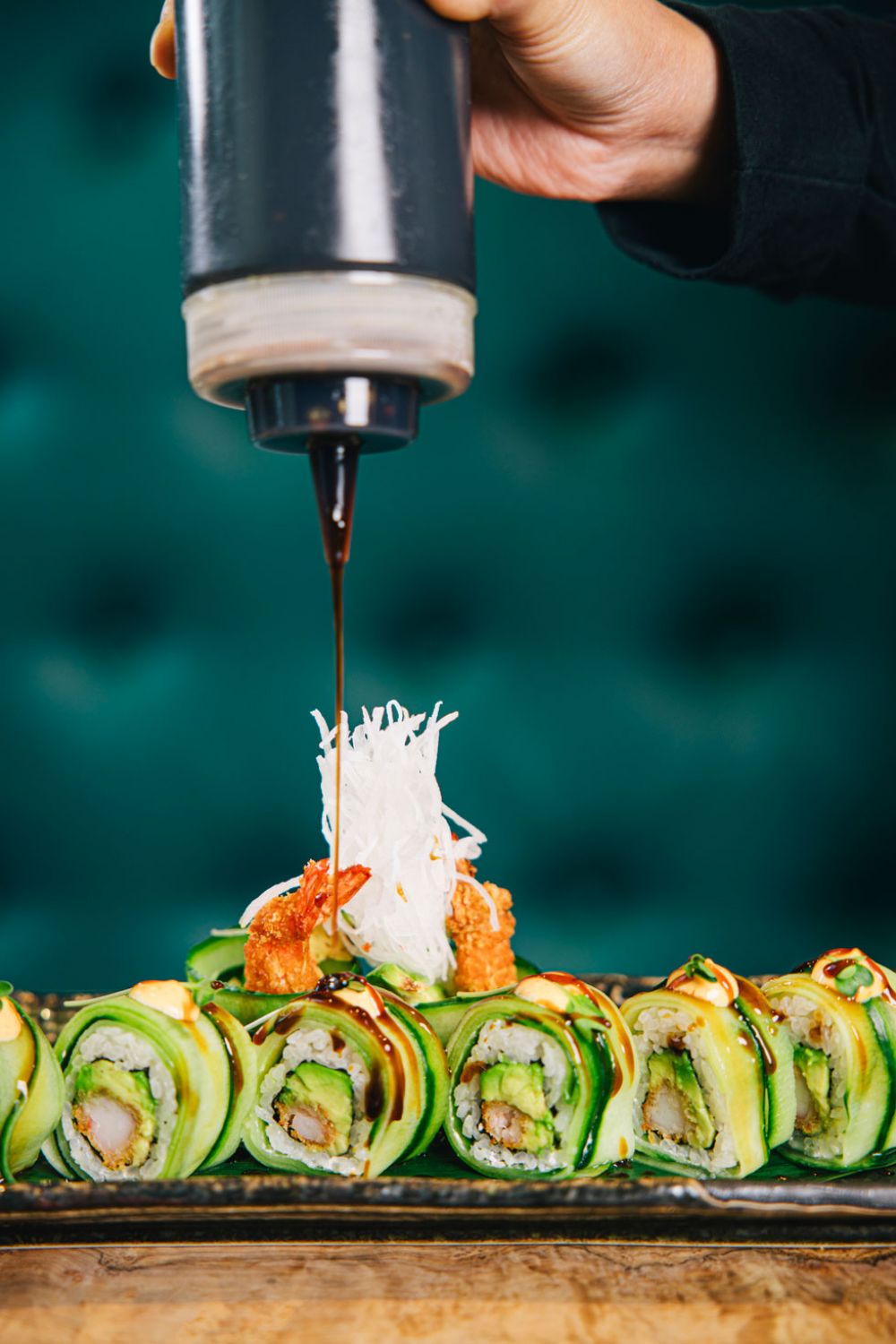 Ebi Tempura, Avocado, Gurke, Spicy Tuna, Tobiko, Schnittlauch