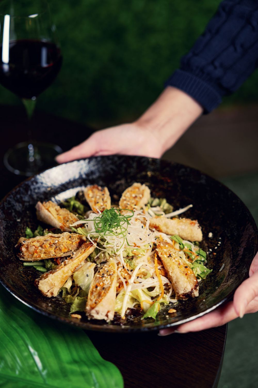 Frischen Salat mit Reisnudeln, Koriander, Minze im Reispapier-Mantel Wahlweise mit a) Panierter Lachs b) Hähnchen c) Bio-Tofu
