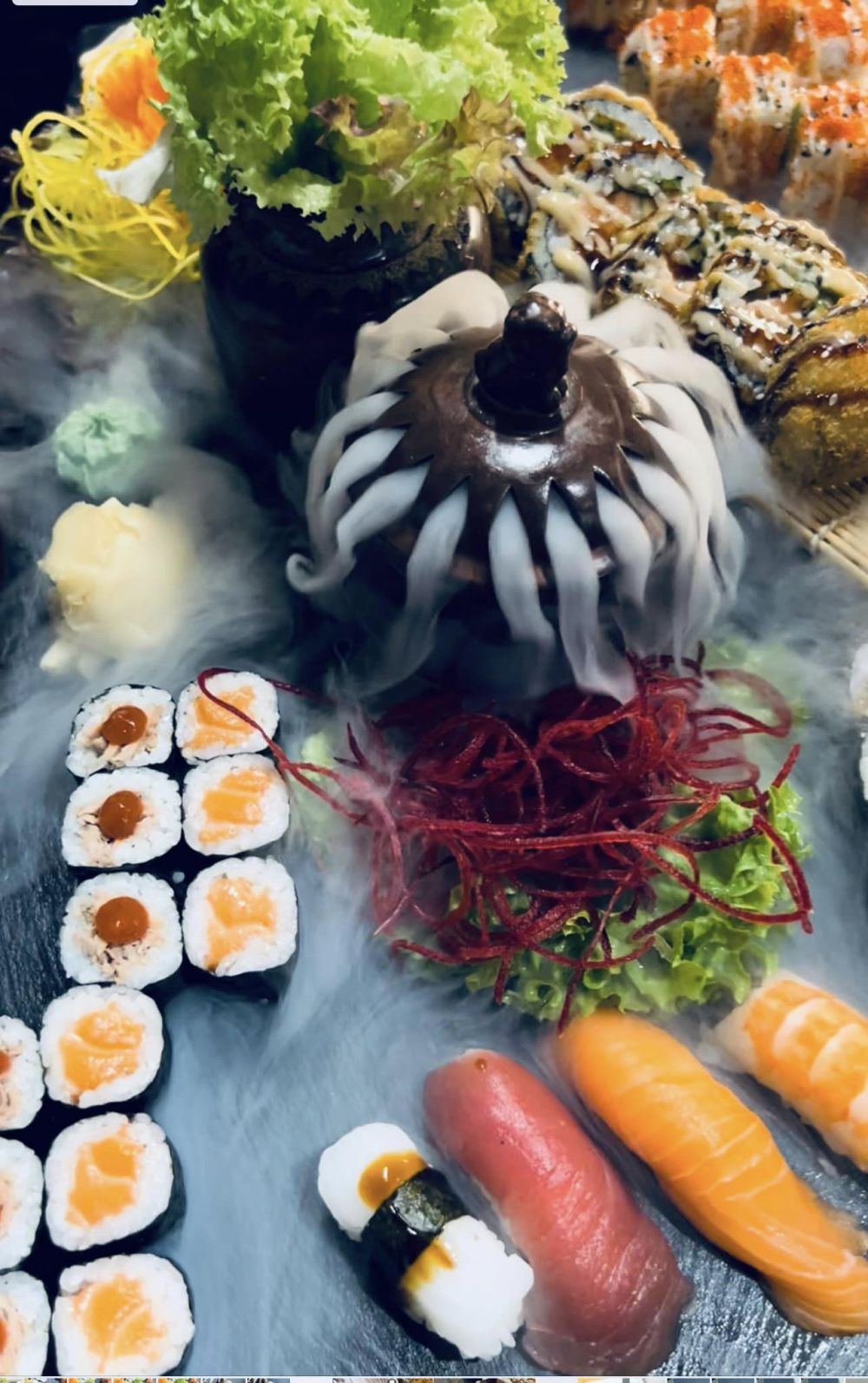 6 stk. Sashimi, 5 stk. Nigiri, 16 stk. I.O Roll, 6 stk. Crunchy Roll