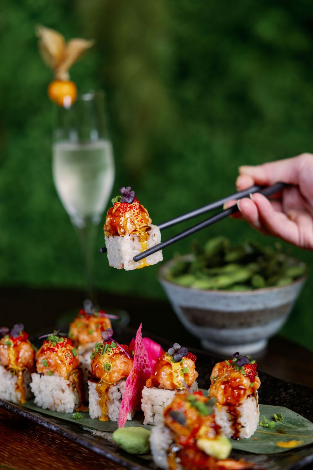 Ebi Tempura, Avocado, Gurke, Spicy Tuna, Tobiko, Schnittlauch